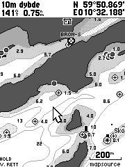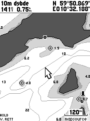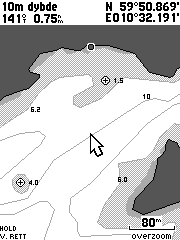 Test BlueChart 6.5 on GpsMap 76S and GpsMap 60CSIn BlueChart the depths shows soundings or depth on obstructions. Soundings are displayed correct for 76S and 60CS, depth of obstructions are not. In the 200m zoom images we can look at the 4.0 m obstruction near the cursor. On 76S the depth is written centred 4 pixels to the right of the obstruction. On 60CS the depth is written 4 pixels to the right of the obstruction and it is moved 10 pixels up. This placing is confusing since it’s not easy to see if this is an obstruction or a sounding. The situation is even worse on zoom 120m and 80m were the depth of obstruction does not show up at all on the 60CS. These images also show how the 60C use a lot of space for the header. The 60CS header is 56 pixels high (23% of the screen), while the 76S header only uses 25 pixels (10.5% of the screen).