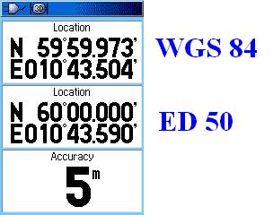| På min GPS har jeg muligheten til å vise posisjon i to datum samtidig, og jeg setter den opp til å vise "WGS 84" øverst og "Europeisk datum 1950 (ED50)" nederst. Hvis vi fikk oppgitt koordinater i ED50 og uten videre plugget dem inn i vår GPS ville vi bommet med neste 100m (50m i n/S etening og 80m i Ø/V retning). Andre steder i landet kan avviket være større eller mindre. |
