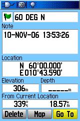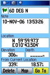 Waypointet ble satt ved å trykke MARK på GPSen. Jeg kan ta fram Waypointet med ulik datumsetting og ser at koordinatene er automatisk omregnet til riktig datum (med unntak av Øst-koordinaten på NGO som er relativ til Greenwich, ikke Oslo). Avstand og retning til punktet er et samme uavhengig av hvordan datum er satt på GPS. |