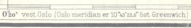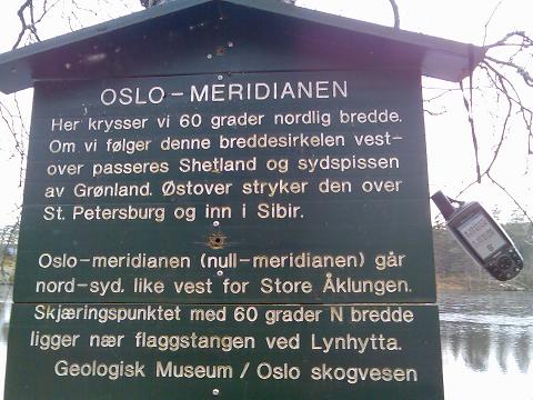 | Mitt gamle nordmarkskart er oppmålt i 1938 og revidert i 1968 (jeg har en nyere et også). Det er et koordinatkryss på kartutsnittet og viser 60° nord og 0 meridianen. Hvis kartet hadde hatt bedre målestokk og vi gikk inn og målte ville vi funnet at skiltet sto på N59°59.927' E000°00.419'. Her er østlig lengde målt relativet til nullmeridianen som går (gikk) gjennom observatoriet i Oslo. Relativt til Greenwich vil koordinatene da bli N59°59.927' E010°43.794'. Dette kartet er oppmålt i NGO-48. | |