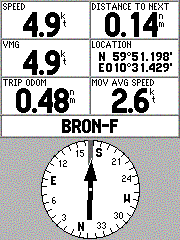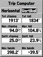 VeipunktFor begge modellene kan man lage nye veipunkt manuelt, fra punktdatabasen eller direkte på kart. Veipunktene lagres med posisjon og høyde. Punktene kan legges direkte til en rute, eller bare lagres som veipunkt. På GpsMap 76 kan man også bruke kompass, sikte og lage nytt veipunkt i valgfri avstand fra der man står langs siktlinjen. RuterFor begge modeller bygges ruter opp ved å legge veipunkt inn i ruten. Rutene lagres med valgfritt navn. Lagrete ruter kan redigeres og reverseres. På GpsMap 76S kan ruten planlegges og redigeres på skjermen. SporBegge modeller kan logge spor, og begge kan bruke sporet til å lage en rute. Måten ruten lages på er ganske ulik på de to modellene. På Garmin brytes sporet når du slår av GPS-en eller mister fix. Du kan derfor ha en del sporfragmenter, og GPS-en gir deg en del alternativer for hvilket sporsegment den skal starte med, og den lager så en rute fra det tidspunkt du velger og til der du står. GPS-en kondenserer sporet og velger et representativt utvalg sporpunkter som gjøres om til veipunkter som inngår i ruten. Denne ruten kan du ha så lenge du ønsker. På Magellan er sporet sammenhengende. Er GPS-en slått av tegnes et spor mellom siste punkt før den ble slått av og første punkt etter at den ble slått på. Tilsvarende om man mister fix. Når man velger å lage en rute ut fra sporet brukes alle sporpunkter, og resultatet legges i en egen sporrute. Denne ruten ligger der til neste gang du lager en rute fra sporloggen. Begge metoder har sine fordeler, GpsMap 76S ruter er varige, mens Meridian Platinums ruter er mer nøyaktige. GpsMap76S har også muligheter for å lagre opp til 10 ruter. Disse kan senere brukes til å lage ruter. Desverre er de lagrete rutene kondensert og strippet for tidsinformasjon, så jeg synes ikke dette var så bra. MenyHovedside