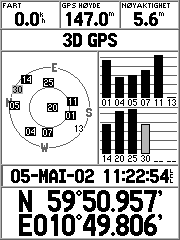 GpsMap 76S viser satelitter, status og posisjon i samme bilde mens Meridian